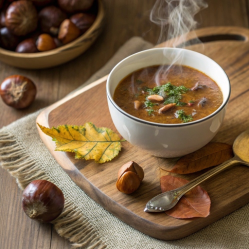 - Подавайте суп-пюре из каштанов с маленькими гренками из белого батона.