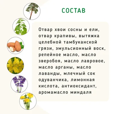 Состав: отвар хвои сосны и ели, отвар крапивы, вытяжка целебной тамбуканской грязи, эмульсионный воск, репейное масло, масло зверобоя, масло лавровое, масло арганы, масло лаванды, млечный сок одуванчика, лимонная кислота, антиоксидант, аромамасло миндаля.