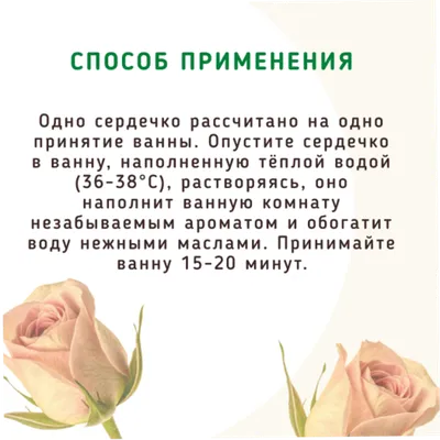 Способ применения: рассчитано на одно принятие ванны. Опустите в ванну, наполненную тёплой водой (36-38°С), растворяясь, оно наполнит ванную комнату незабываемым ароматом и обогатит воду нежными маслами. Принимайте ванну 15-20 минут.