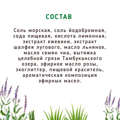 Состав: соль морская, соль йодобромная, сода пищевая, кислота лимонная, экстракт ежевики, экстракт шалфея лугового, масло льняное, масло семян чиа, вытяжка целебной грязи Тамбуканского озера, эфирное масло розы, экоглиттер, пищевой краситель, ароматическая композиция эфирных масел.