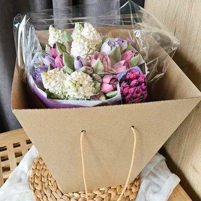 *Цвет упаковки, лент может различаться. Но обязательно будет сочетаться с цветами в букете и подчёркивать их красоту.