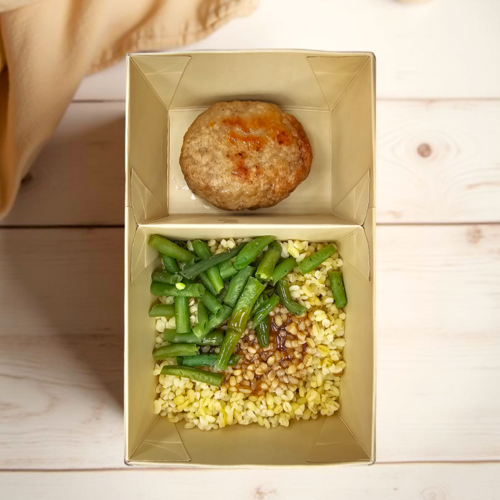 Сочный шницель из свинины и куриного филе в хрустящей панировке с рассыпчатым булгуром и стручковой фасолью. Натуральные ингредиенты в составе — качественное мясо, свежие овощи и натуральные специи. Сбалансированное блюдо с высоким содержанием белка и клетчатки готово за 4 минуты в микроволновке. Сохраняет все питательные вещества и насыщенный вкус после разогрева. Удобный вариант полноценного обеда или ужина для тех, кто ценит время, но следит за питанием.
