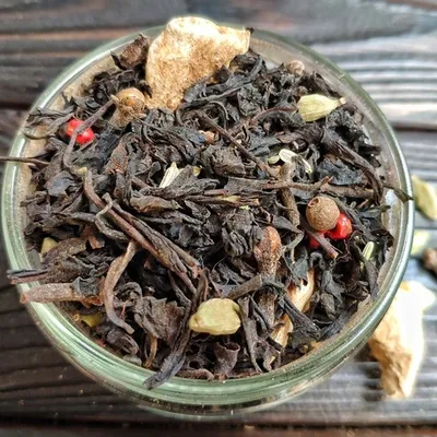 Состав: черный чай, имбирь, кардамон, гвоздика, фенхель, анис, бадьян, смесь перцев, корица.