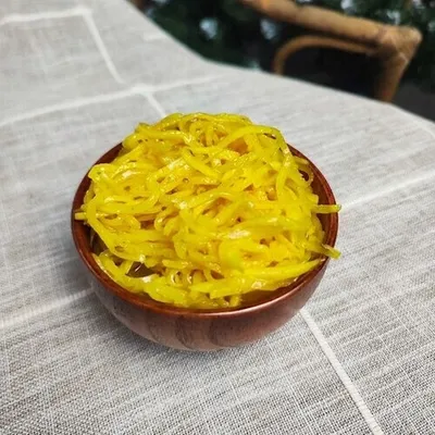 Дайкон и морковь нарезаются тонкой соломкой и маринуются в специально приготовленной заправке. В составе: натуральный уксус, свежий чеснок, растительное масло, сахар, соль и традиционный комплекс корейских специй. Каждый ингредиент тщательно подобран для создания аутентичного вкуса, характерного для азиатской кухни. Процесс приготовления включает выдержку в маринаде, что позволяет овощам пропитаться ароматами специй и приобрести насыщенный вкус.