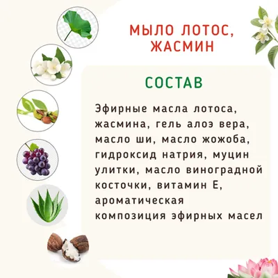 Натуральное мыло с эфирными маслами лотоса и жасмина подходит для ухода за зрелой кожей лица и тела, нуждающейся в особом внимании и заботе.