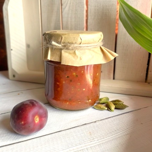 Натуральный джем из спелой сливы с тёплыми нотами кардамона и лёгкой хвойной пряностью можжевельника. Приготовлен без искусственных добавок. Гармония глубокой фруктовой сладости и согревающих пряностей для утончённого вкуса.