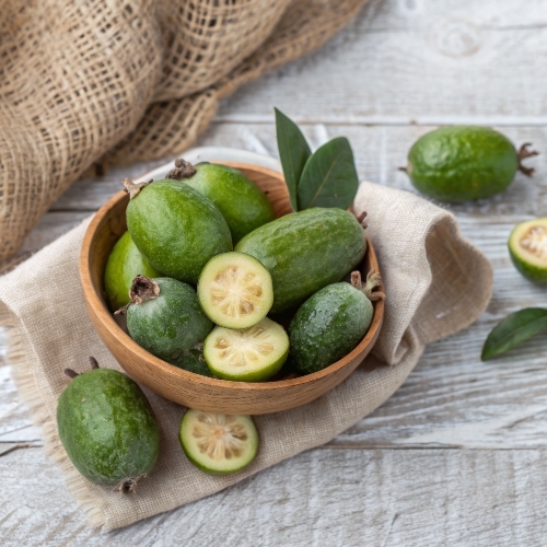 Фейхоа – экзотический фрукт с неповторимым вкусом и множеством полезных свойств. Напоминает сочетание ананаса, груши и клубники. Он не только радует своим необычным ароматом, но и становится настоящей находкой для любителей здорового питания. Этот фрукт богат витаминами, минералами и антиоксидантами, что делает его идеальным выбором для поддержания иммунной системы и общего здоровья.