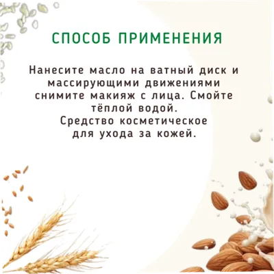 Способ применения: нанесите масло на ватный диск и массирующими движениями снимите макияж с лица. Смойте тёплой водой.
