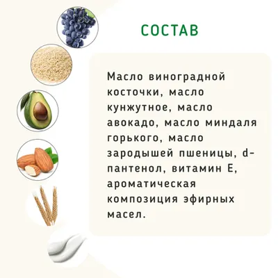 Состав: масло виноградной косточки, масло кунжутное, масло авокадо, масло миндаля горького, масло зародышей пшеницы, d-пантенол, витамин Е, ароматическая композиция эфирных масел.