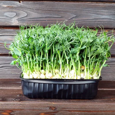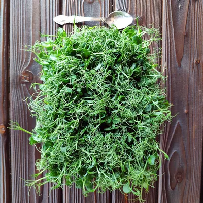 Микрозелень горох афилла имеет привлекательные завивающиеся усики. Это одно из самых высоких микро-растений, часто его выращивают даже до появления цветов (10–20 см).