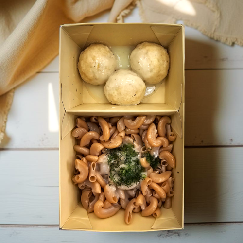 Это блюдо сочетает в себе домашний вкус и современное удобство. Нежные фрикадельки из куриной грудки готовятся с добавлением натуральных ингредиентов, а гречневые макароны сохраняют свою упругую текстуру после разогрева. Пикантный горчичный соус с нотками мускатного ореха и дижонской горчицы придает блюду насыщенный вкус. Каждый компонент продуман для создания гармоничного и полезного обеда.