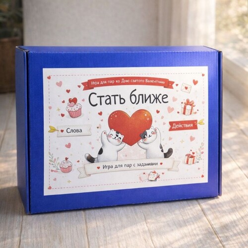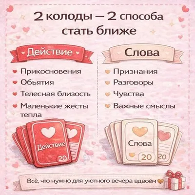 Это не просто игра — это путь из шагов к теплу, нежности и живому общению. В колодах по 20 заданий каждого вида.