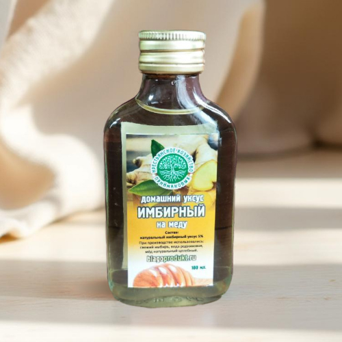 Натуральный уксус на имбире и мёде. Обладает согревающим, пряным вкусом и комплексным оздоровительным действием. Подходит для оздоровительного приёма, кулинарии и профилактики.