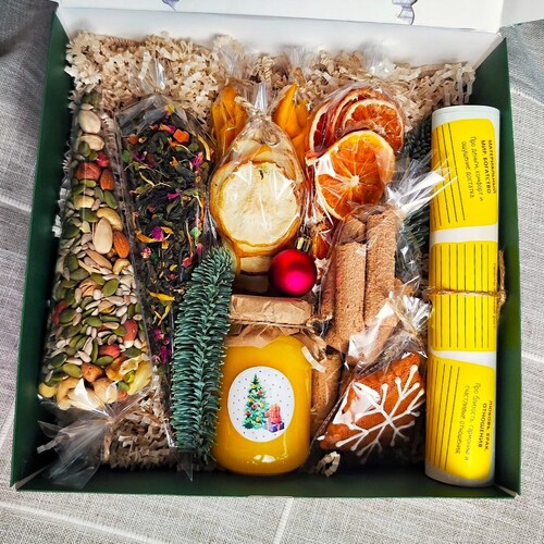 Для настроения и уюта: коллекция натуральных лакомств, чтобы сладкое сопровождало сладкие мысли (тирамису 35 г, чипсы груши 30 г, манго сушёное 2×30 г, ассорти орехов 150 г, мёд луговой 250 г, чипсы апельсиновые 20 г, чай «1001 ночь» 40 г, пряник «Снежинка», пряник «Ёлочка»).