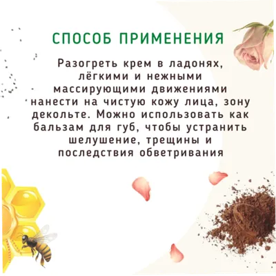 Способ применения: разогреть крем в ладонях, лёгкими и нежными массирующими движениями нанести на чистую кожу лица, зону декольте. Можно использовать как бальзам для губ, чтобы устранить шелушение, трещины и последствия обветривания.
