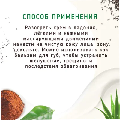 Способ применения: разогреть крем в ладонях, лёгкими и нежными массирующими движениями нанести на чистую кожу лица, зону декольте. Можно использовать как бальзам для губ, чтобы устранить шелушение, трещины и последствия обветривания.