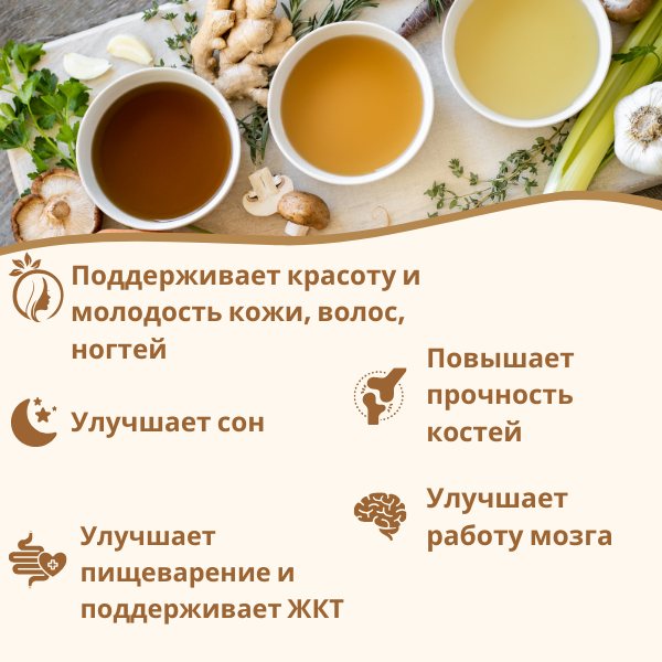 Говяжий бульон — природный источник коллагена, глюкозамина и аминокислот, которые укрепляют суставы, улучшают состояние кожи и поддерживают здоровье кишечника. Кости говядины богаты кальцием и фосфором, необходимыми для крепости костей. Специи глинтвейна (бадьян, гвоздика, мускатный орех) обладают согревающими и противовоспалительными свойствами, улучшают кровообращение и пищеварение. Клюква и цитрусы насыщают бульон витамином С и антиоксидантами, укрепляя иммунитет. Яблочный уксус способствует усвоению минералов из костей.