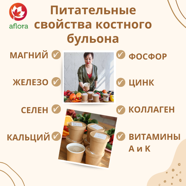 - в составе костного бульона содержатся десятки разнообразных питательных веществ, включая 19 аминокислот (которые часто называют «строительными элементами белка»). Аминокислоты поддерживают здоровый обмен веществ, здоровье кишечника, суставов и поддерживают мышечную массу