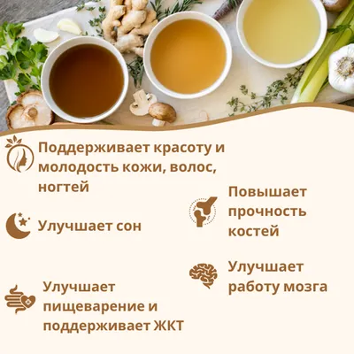 - в составе костного бульона содержатся десятки разнообразных питательных веществ, включая 19 аминокислот (которые часто называют «строительными элементами белка»). Аминокислоты поддерживают здоровый обмен веществ, здоровье кишечника, суставов и поддерживают мышечную массу
