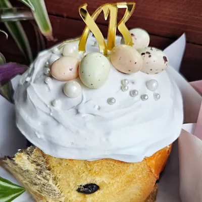 Предлагаем попробовать готовый кулич ручной работы. Классическое угощение с плотным дрожжевым тестом и изюмом, милый праздничный дизайн - все это позволит куличу стать украшением стола на праздник.