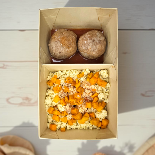 Сытное и полезное блюдо с нежными мясными фрикадельками и золотистой тыквой на подушке из кускуса. Полноценный обед всего за 4 минуты в микроволновке — идеально для рабочего перерыва или быстрого ужина. Насыщенный томатный соус с пряными нотами создает гармоничный вкус. Удобно брать с собой и легко разогревать без потери качества — как свежеприготовленное.