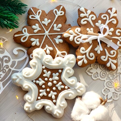 Изысканные пряники в виде ажурных снежинок — элегантный новогодний подарок, который подчеркнет ваш безупречный вкус и внимание к деталям. Натуральный состав на основе меда и ручная роспись делают каждый пряник уникальным произведением. Они станут желанным презентом для близких, детей, друзей, коллег и партнеров. Идеальное сочетание деликатности, заботы о здоровье. Подходит для корпоративных подарков.