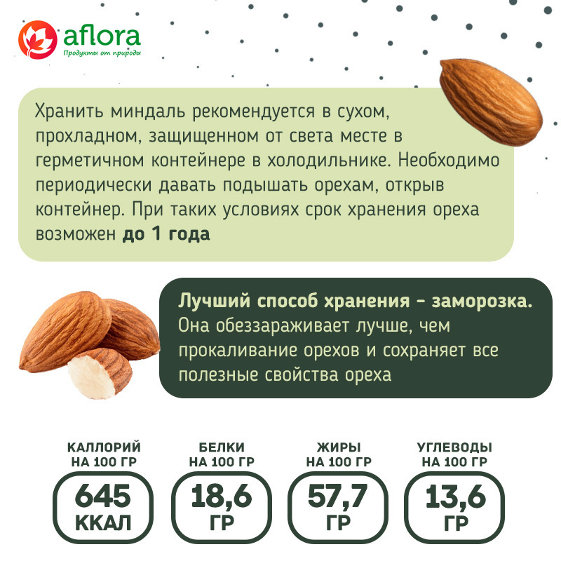 Хранить миндаль рекомендуется в сухом, прохладном, защищенном от света месте в герметичном контейнере в холодильнике. Необходимо периодически давать подышать орехам, открыв контейнер. При таких условиях срок хранения ореха возможен до 1 года. Если есть сомнения в качестве ореха, лучший способ хранения - заморозка, она обеззараживает лучше, чем прокаливание орехов и сохраняет все полезные свойства ореха. Возможно хранение орехов при комнатной температуре при условии, что планируете их употребить в течение 2-х недель.