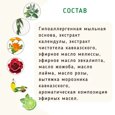 Состав: гипоаллергенная мыльная основа, экстракт календулы, экстракт чистотела кавказского, эфирное масло мелиссы, эфирное масло эвкалипта, масло жожоба, масло лайма, масло розы, вытяжка морозника кавказского, ароматическая композиция эфирных масел.