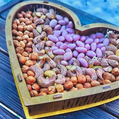 Если вы ищете натуральный и полезный подарок для своей семьи или друзей, наш подарочный набор орехов в красивой деревянной коробке в виде сердца станет отличным решением! Состав: миндаль в брусничном йогурте, очищенный фундук, жареный кешью - идеальный выбор для тех, кто ценит здоровье и вкус!