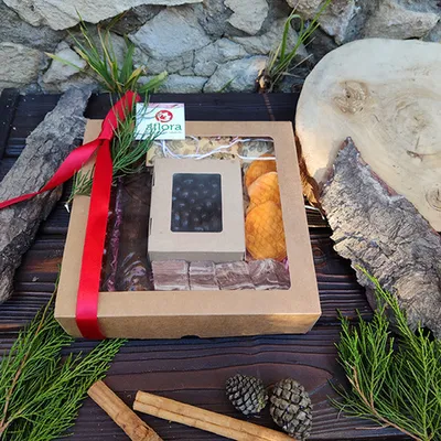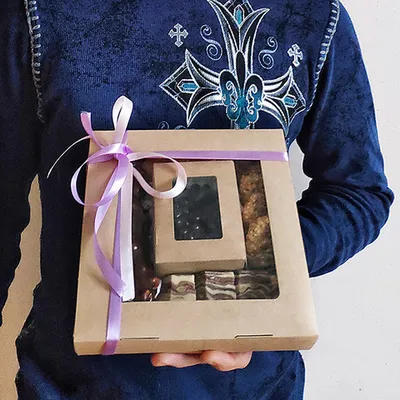 Продукты упакованы в красивую подарочную коробку с окном. В такой упаковке вся продукция плотно закрыта, что позволяет сохранить вкусовые качества.
