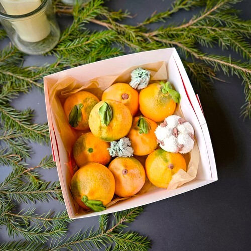 Воздушный зефир в виде спелых мандаринов — праздничное угощение для взрослых и детей. Нежная текстура на основе яблочного сока и апельсинового пюре с лёгкими нотками ванили и кокосовой стружки. Натуральные ингредиенты и яркий дизайн создают новогоднее настроение. Идеально подходит для сладких подарков и украшения праздничного стола.