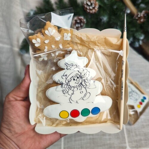 Уникальный интерактивный набор для творчества и сладкого удовольствия! Пряник в форме новогодней ёлки с уже нанесёнными пищевыми красками в контуре снеговика станет прекрасным развивающим подарком для ребенка. В комплекте вы найдете удобную кисточку — просто смочите её водой и обмакните в краски на самом прянике! Продукт изготовлен вручную из полностью натуральных ингредиентов — прекрасный способ совместить весёлое развлечение с безопасным и вкусным угощением.