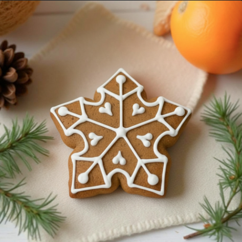 Ажурная снежинка из пряничного теста с изящной белой росписью демонстрирует мастерство ручной работы. Чёткие грани и тонкие узоры покрыты глазурью, напоминающей зимний иней. В основе рецепта — натуральный мёд, качественная мука и сливочное масло, а согревающие специи (корица, имбирь, мускатный орех) создают тот самый праздничный аромат. Каждый элемент тщательно проработан, что делает пряник не просто угощением, а настоящим произведением кондитерского искусства.