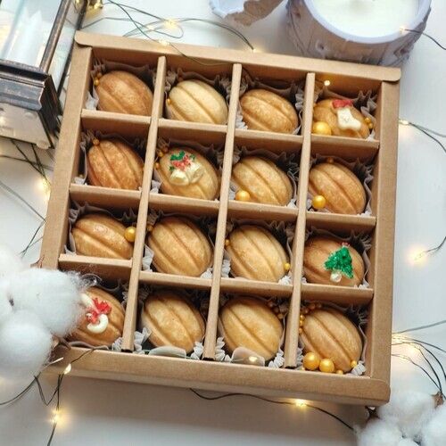 В наборе — 16 аккуратных орешков, приготовленных по классическому рецепту. Нежное песочное тесто на сливочном масле и фермерских яйцах сочетается с сладкой варёной сгущёнкой и хрустящим фундуком. Каждый орешек изготовлен вручную, что делает его уникальным и сохраняет домашний вкус. Упаковка с новогодним дизайном добавляет праздничного настроения.
