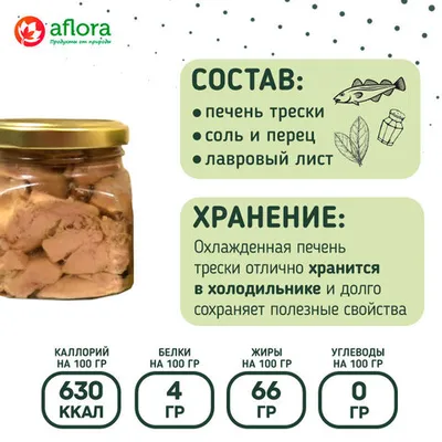 Натуральная печень трески без консервантов, приезжает из Мурманска. Консервы из отдельных кусочков мяса, а не бесформенной массой. Печень заливается собственным жиром, приправляется солью, перцем и лавровым листом, что придает ей пикантный вкус. Консервируется прямо в море, на трале. А стеклянная тара позволяет убедиться в качестве продукта.