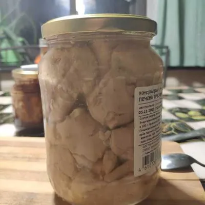 Натуральная печень трески без консервантов, приезжает из Мурманска. Консервы из отдельных кусочков мяса, а не бесформенной массой. Печень заливается собственным жиром, приправляется солью, перцем и лавровым листом, что придает ей пикантный вкус. Консервируется прямо в море, на трале. А стеклянная тара позволяет убедиться в качестве продукта.