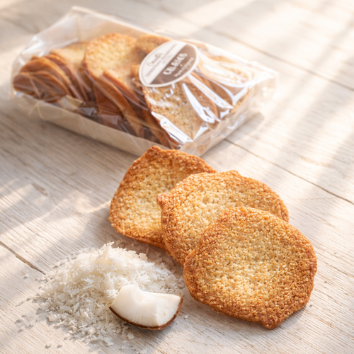 Хрустящее печенье с натуральной кокосовой стружкой и сливочным маслом. Обладает рассыпчатой текстурой, золотистым цветом и тёплым ароматом кокоса. Каждый кусочек тает во рту, оставляя приятное сладкое послевкусие.