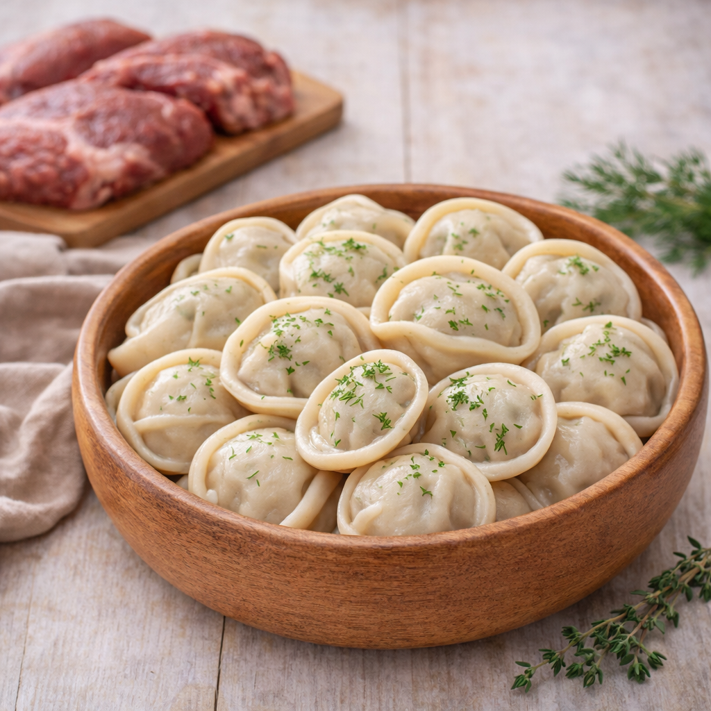 Пельмени с бараниной — это сытное и ароматное блюдо ручной работы. Начинка приготовлена из отборной баранины без субпродуктов, с добавлением репчатого лука и свежемолотого чёрного перца. Тесто замешано на муке без химического отбеливания и артезианской воде.