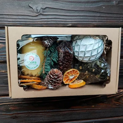 Упакован в коробку 19*16 см, с большим «окном» в крышке. Перевязан ленточкой, внутри бумажный наполнитель, декоративные хвойные ветки и шишки, а также шарик на елку для новогоднего настроения.