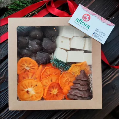 Продукты упакованы в красивую плотную картонную коробку с окном. В коробочку можем вложить визитку с надписью (сообщите менеджеру при заказе, если хотите дополнить набор поздравительной открыткой или запиской).