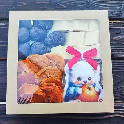 Продукты упакованы в красивую плотную картонную коробку с окном. В коробочку можем вложить визитку с надписью (сообщите менеджеру при заказе, если хотите дополнить набор поздравительной открыткой или запиской).
