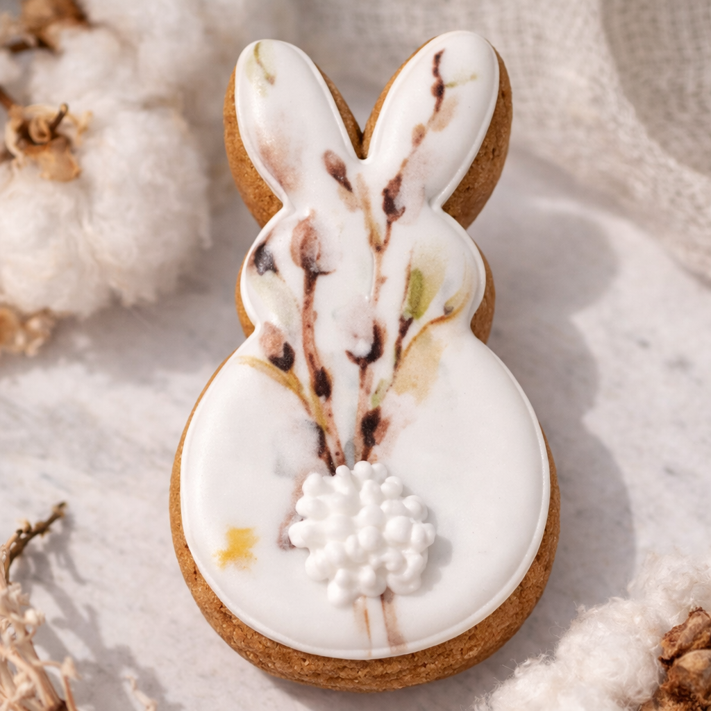 Пряник «Зайчик Верба» готовится по традиционному рецепту медового теста с использованием натуральных ингредиентов. После выпечки изделие покрывается гладкой глазурью, на которой аккуратно наносится рисунок веточек вербы. Белая глазурь и мягкие природные оттенки росписи создают спокойный и очень весенний образ.