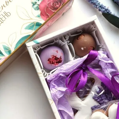 Праздничный набор к 8 Марта: расписной пряник-восьмёрка и две шоколадные конфеты ручной работы. Пряник из цельнозерновой муки и мёда, конфеты из бельгийского шоколада с фундуком и малиной.