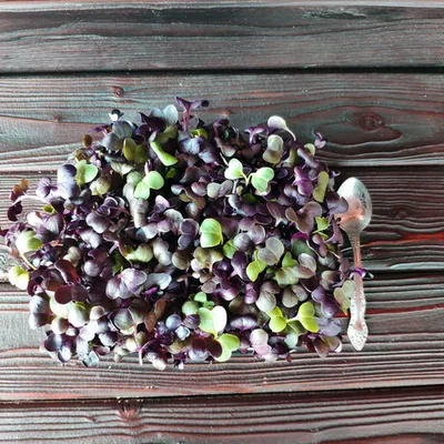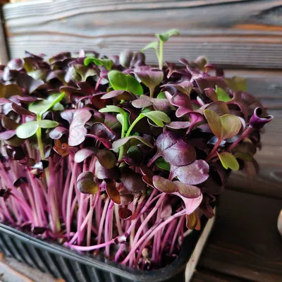 Росточки фиолетового редиса обладают изысканным пряным вкусом и выглядят необыкновенно аппетитно. Оригинальный цвет и форма листиков делают эту микрозелень одной из самых популярных.