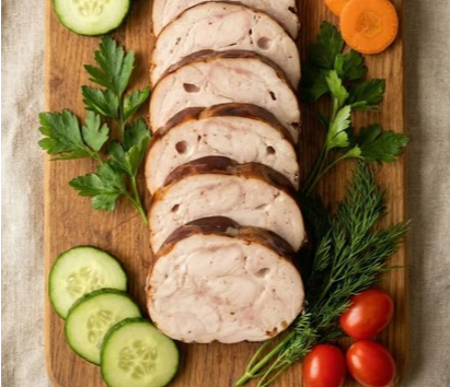 Рулет из кролика удобно нарезать для бутербродов, подать к завтраку или использовать как готовое мясное блюдо к ужину. Подходит для повседневного рациона и быстрой подачи к столу.
