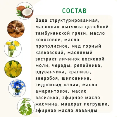 Состав: вода структурированная, масляная вытяжка целебной тамбуканской грязи, масло кокосовое, масло прополисное, мед горный кавказский, масляный экстракт личинок восковой моли, череды, репейника, одуванчика, крапивы, зверобоя, шиповника, гидроксид калия, масло амарантовое, масло василька, эфирное масло жасмина, мацерат петрушки, эфирное масло лаванды.