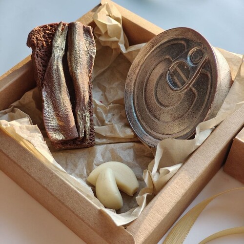 Этот уникальный набор полностью изготовлен из шоколада. Он включает в себя точную копию закрытой консервной банки, отлитую из молочного бельгийского шоколада, а также отдельную композицию «шпроты на хлебе», где и рыбы, и хлеб также сделаны из разных видов шоколада. «Банка» является полноценной съедобной частью подарка. Для детализации используются натуральные красители. Внутри некоторых элементов может добавляться дроблёный фундук для текстуры и вкуса.