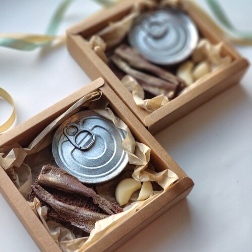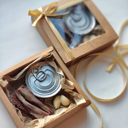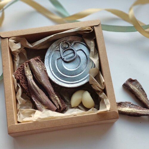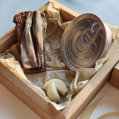 Юмористический набор: закрытая консервная банка и шпроты на хлебе, целиком сделанные из бельгийского шоколада. Всё съедобно, включая саму банку. Натуральный состав с фундуком. Оригинальная и запоминающаяся идея.