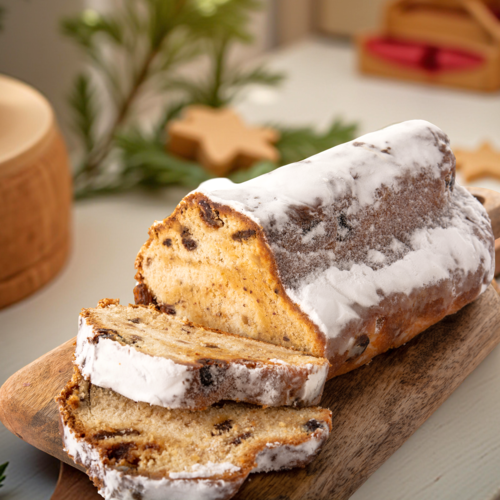 Это простой с виду кекс продолговатой формы с ароматной начинкой из изюма, мака, цукатов, орехов или марципана. Сверху выпечка покрыта обильным слоем сахарной пудры, выглядит эффектно и в то же время сдержанно.