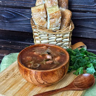 Состав: говядина, ветчина, сосиски, грибы шампиньоны, лук репчатый, соленые огурцы, томатная паста, маслины, вода, зелень петрушки, зелень укропа, лавровый лист, перец черный молотый, соль, растительное масло